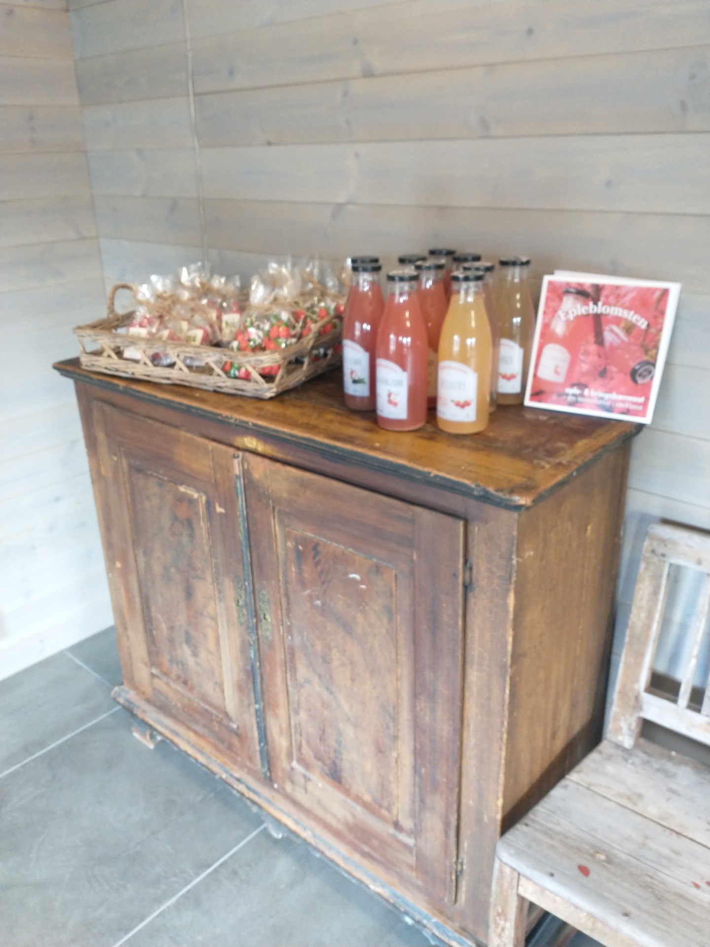 Gårdsbutikk med bl.a saueskinn, honning, eplemost.